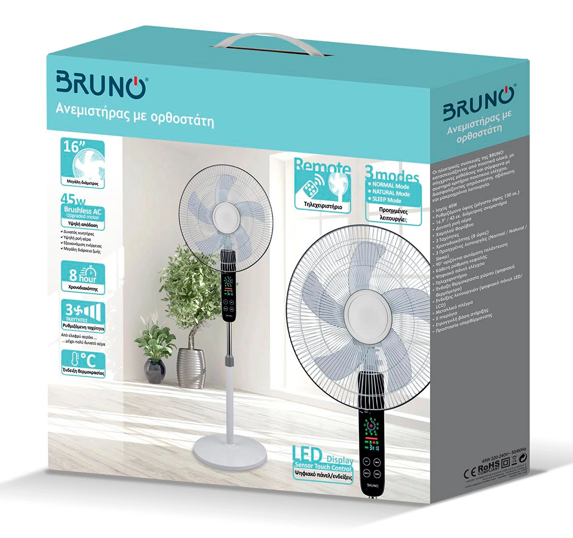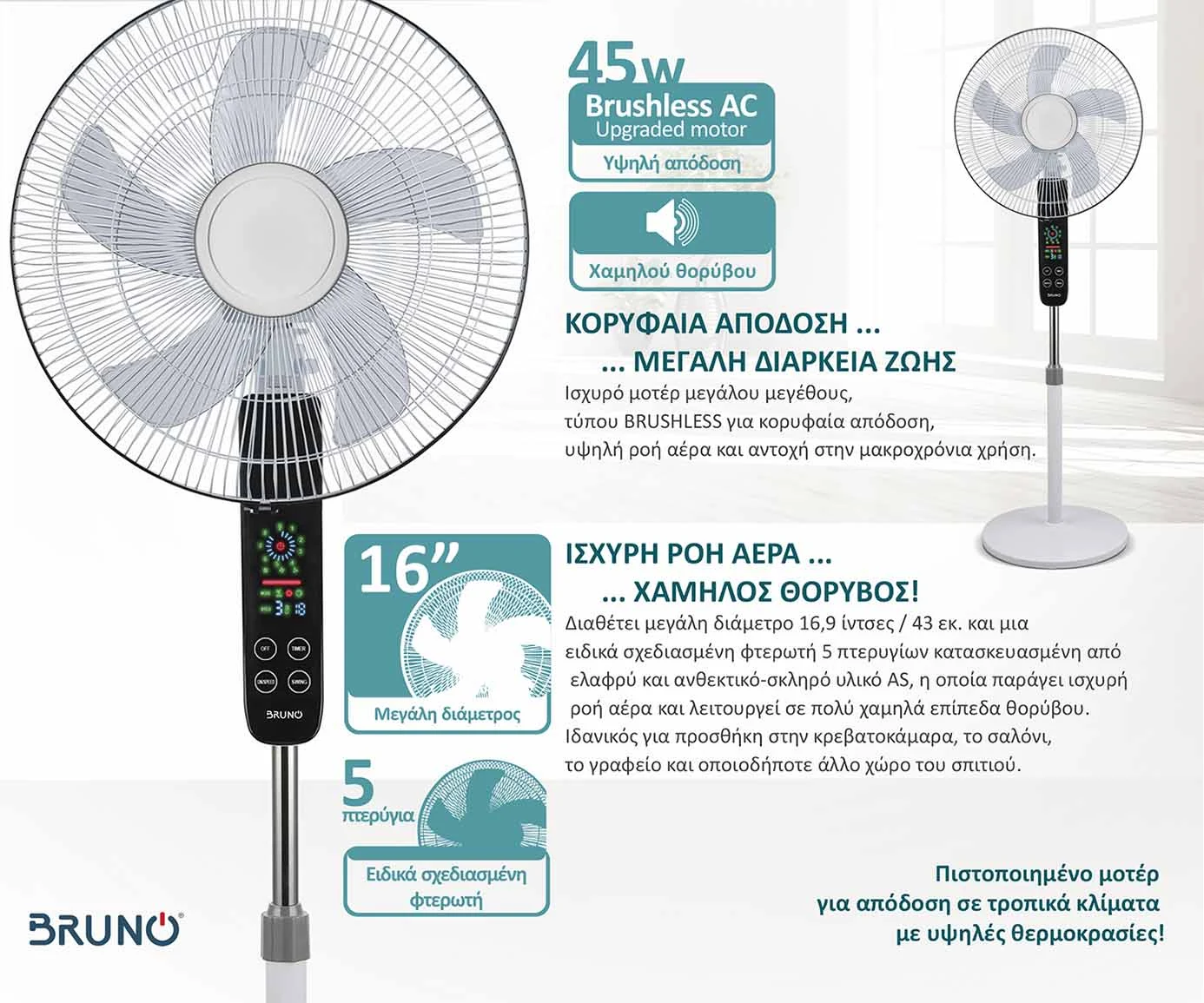 Η ειδικά σχεδιασμένη φτερωτή 5 πτερυγίων κατασκευασμένη από ελαφρύ και ανθεκτικό-σκληρό υλικό AS, παράγει ισχυρή ροή αέρα και λειτουργεί σε πολύ χαμηλά επίπεδα θορύβου, καθιστώντας τον ανεμιστήρα BRUNO ιδανικό για τοποθέτηση στην κρεβατοκάμαρα, το σαλόνι και οποιοδήποτε άλλο κατάλληλο χώρο του σπιτιού ή του γραφείου σας