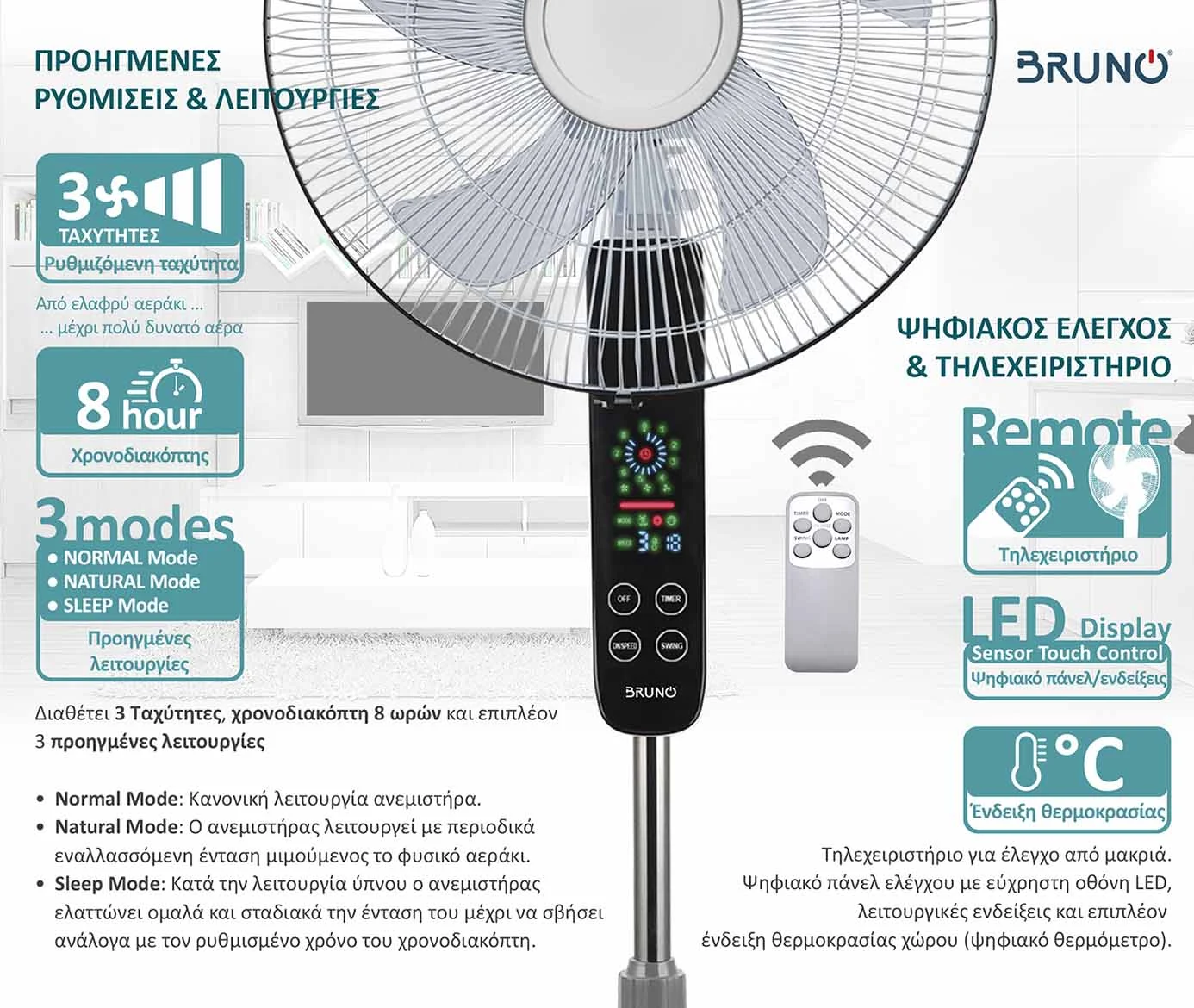 Διαθέτει επίσης 3 MODE λειτουργίας, (Normal / Natural / Sleep) και 3 ταχύτητες ανεμιστήρα